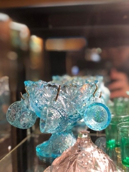 Each room is filled with case filled with various collections of antique glass. My favorites were the depression glass and children’s glass objects (child size dishes, cups and salt cellars). The rooms are filled with sparkling light in all shade of the rainbow reflecting off the glass. Each collection is carefully marked and described so that you know what you are looking at. The docents at the museum are friendly and excited to share the unique history of vintage glass and how they came to love antique glass objects. The stories are fascinating and I would have loved to pull up a chair and spend the day chatting.